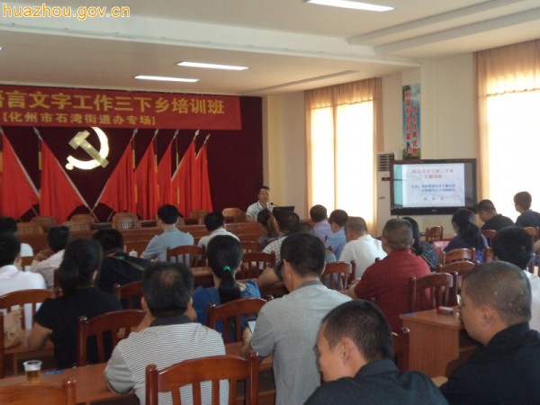 10月15日下午,茂名市语言文字工作三下乡(宣讲语言文字法规工作下乡、推广普通话工作下乡、使用规范字工作下乡)培训班在石湾街道办六楼会议室举行。石湾街道全体街村(居)干部、中小学校长、骨干教师等100多人参加培训。培训班由石湾街道党委副书记、街道办主任黄亚春同志主持并作动员讲话。