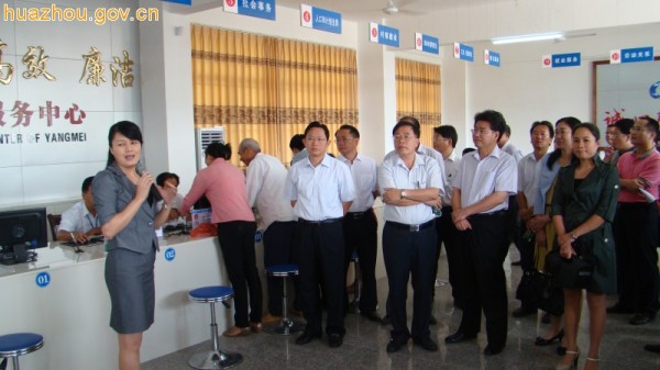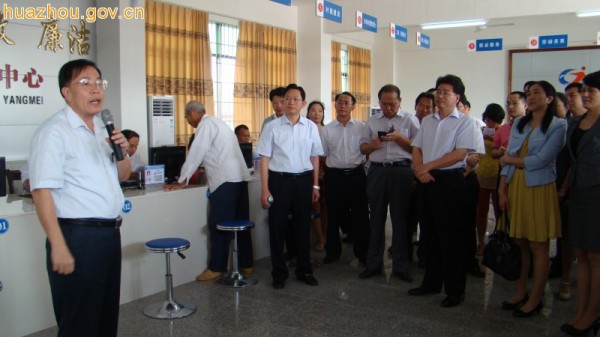 10月25日上午,茂名市、县、镇、村四级网上办事暨政务服务建设现场会在化州市召开,现场会第一站是参观化州市杨梅镇行政服务中心。茂名市副市长梁罗跃,茂名市政府副秘书长、政管办主任李清汉,化州市委副书记、市长林振光,化州市政管办主任黄士杰以及各县(市、区)政府、监察局、编办、经信局、民政局等主要领导、相关人员和各镇(区、街道)分管领导等200多人参加了现场会。