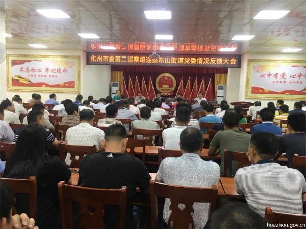 2018年8月27日上午9点在街道一楼第一会议室召开化州市委第二巡察组巡察东山街道党委情况反馈大会,会议由街道党委书记庄君智主持,参会人员包括街道党政领导班子成员及街道干部、机关事业单位主职、村(社区)党总支部书记、主任。