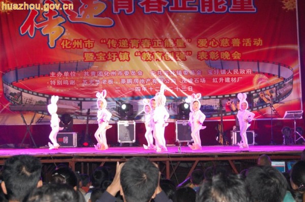 12月23日晚,由团化州市委联合宝圩镇党委、政府举办的“化州市‘传递青春正能量’爱心慈善活动暨宝圩镇‘教育创强’表彰晚会”在宝圩中心小学举行,团化州市委副书记曾子芬、市教育局副局长梁华清,宝圩镇全体党政领导班子、镇政府所有干部职工、各中小学校的教师、学生等共300多人参加了本次晚会。