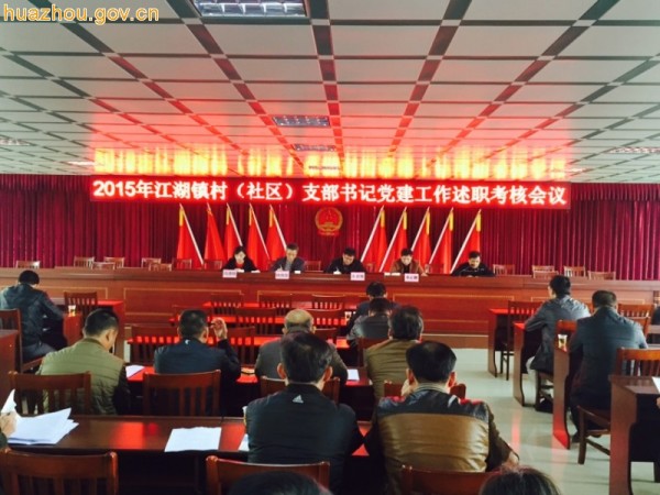 为认真贯彻习近平总书记关于落实全面从严治党责任,加强党的基层组织建设的重要指示精神,2015年12月29日,江湖镇召开2015年村(社区)支部书记党建工作述职考核会议。市委组织部领导出席会议,该镇领导班子成员、镇委基层治理领导小组成员、各村(社区)干部共72人参会。会议由该镇镇长李正辉主持。