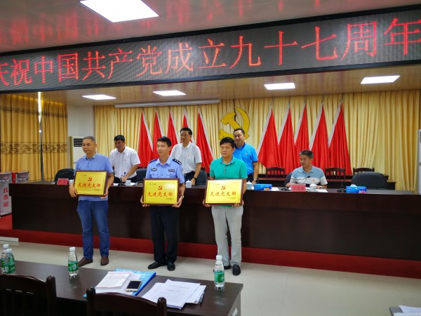 市委副书记、政法委书记周太强和杨梅镇党委主要领导为优秀共产党员颁发奖牌