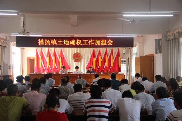 5月30日下午,播扬镇在镇府五楼会议室召开土地确权工作加温会。播扬镇全体镇干部、各村(社区)支部书记等70多人参加会议。会议由播扬镇人大主席何仁静主持。化州市农业局党组成员叶广森,播扬镇委副书记、镇长王宝丹出席会议。