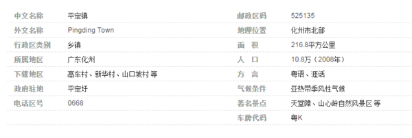 平定镇地处广东省化州市北部,位于两广、三县(市)、九乡镇交汇处。圩镇建成区面积5.8平方公里,常驻人口达2.5万人。按照平定镇2001年至2020年总体规划,圩镇共划分商贸区、住宅区、政治文化区、科技教育区、工业区等五个功能区。