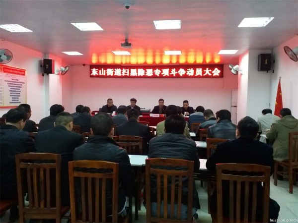 2018年2月12日,东山街道召开扫黑除恶专项行动动员大会,街道全体干部职工,村(社区)支部书记、主任,各机关单位主职等参加会议。会议由街道办党委副书记、街道办主任姚憬敏主持。