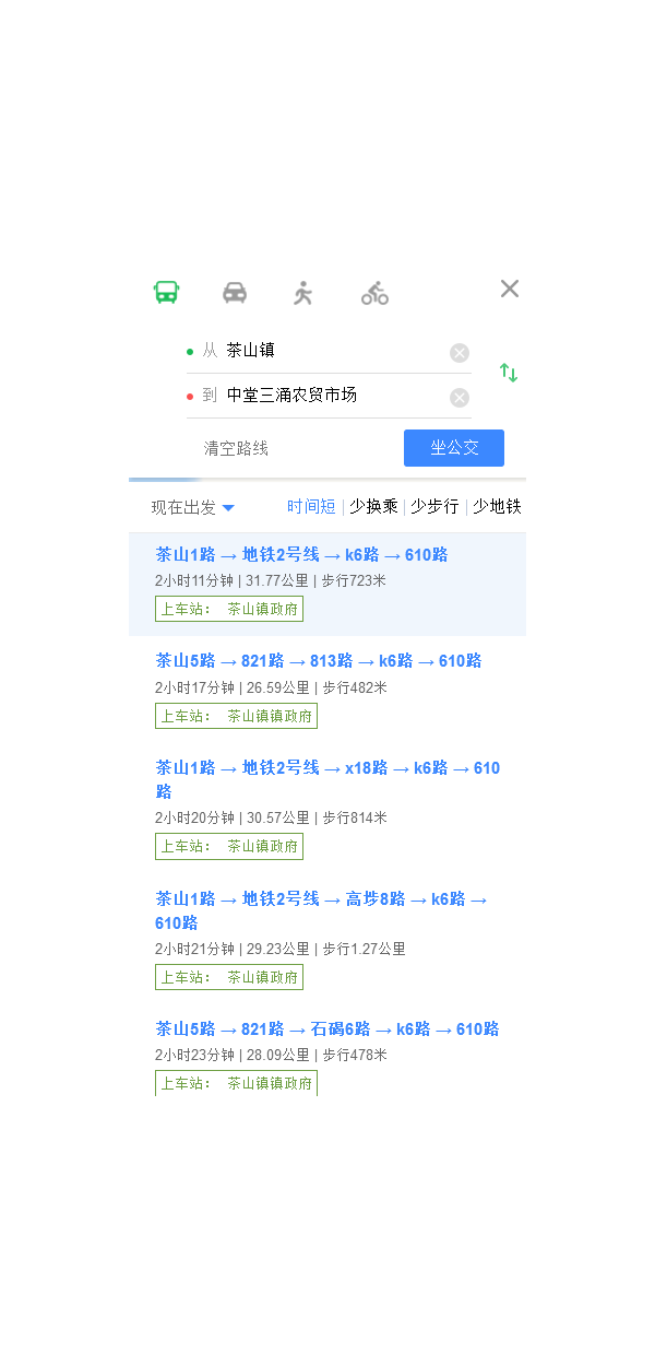 茶山1路 → 地铁2号线 → k6路 → 610路