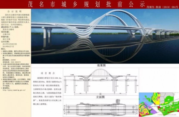 清福港大桥全长1086.4米,跨海长度580米,按设计速度60km/h的双向六车道一级公路标准建设,主桥桥型中承式拱桥,造型元素取自海丝之路,与清福港起伏的波浪相互辉映,设计主题为“海丝铸梦”,寓意茂名续写21世纪海上丝绸之路上新辉煌。