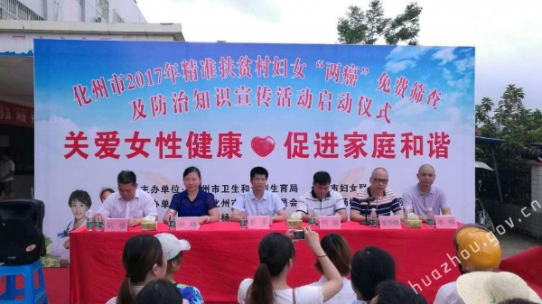 9月25日,以“关爱女性健康,促进家庭和谐”为主题的化州市2017年精准扶贫村妇女“两癌”免费筛查及防治知识宣传活动在杨梅镇卫生院正式启动。杨梅镇党委书记彭卓、镇长何强、市妇联副主席余瑾、市卫计局党组成员黎委帼、市妇幼保健计划生育服务中心主任陆雄、杨梅卫生院院长李伟等领导出席了活动启动仪式。杨梅镇计生办全体工作人员、卫生院工作人员以及精准扶贫村低埇村委会35-64岁妇女共100多人参加了活动。